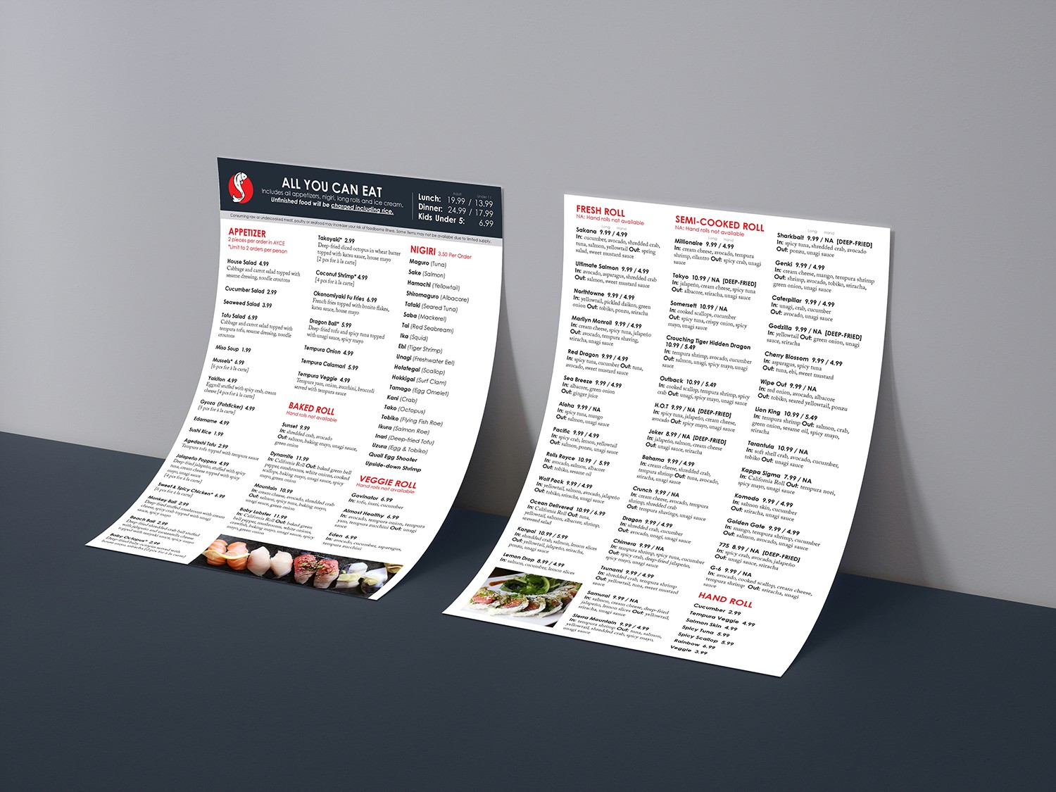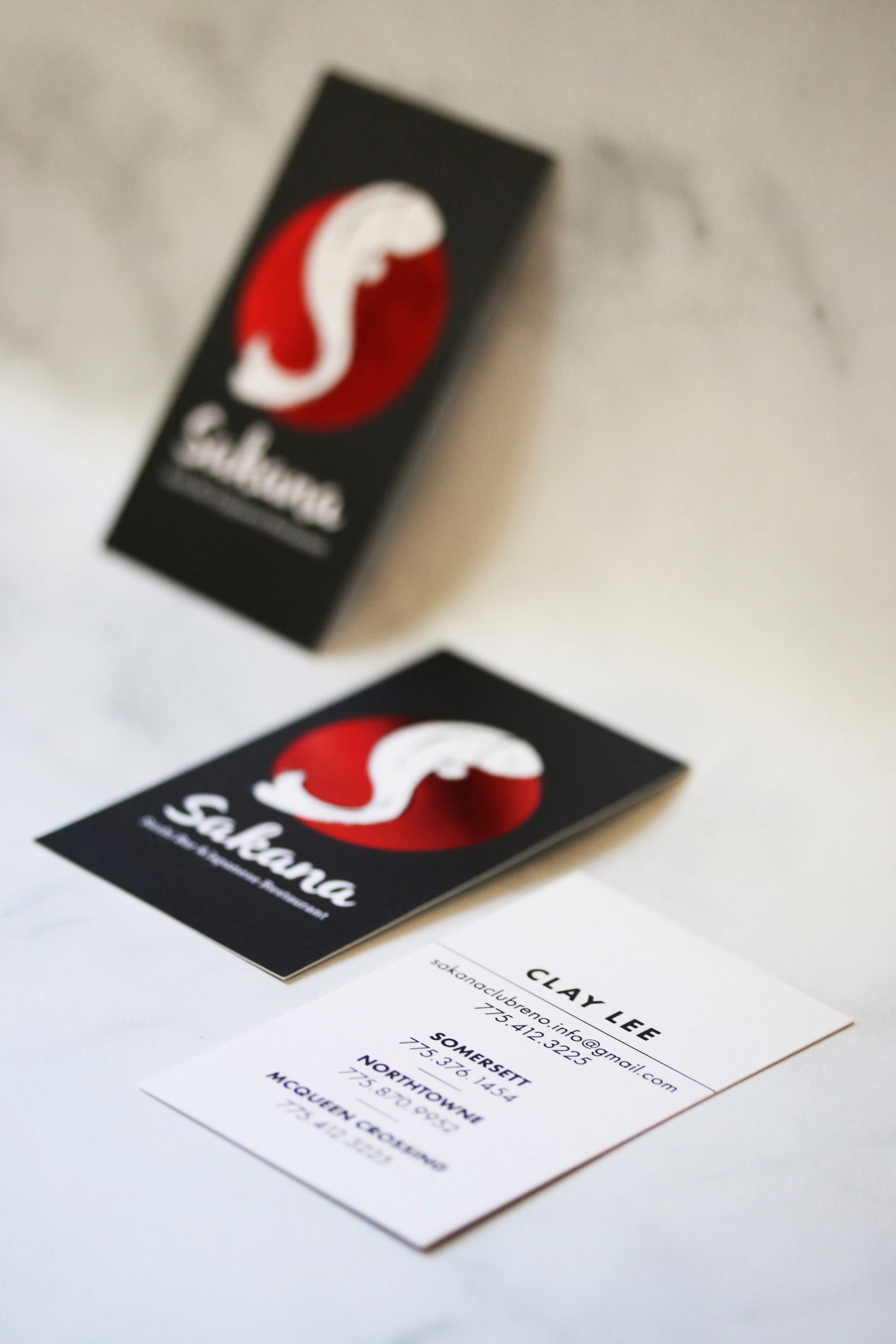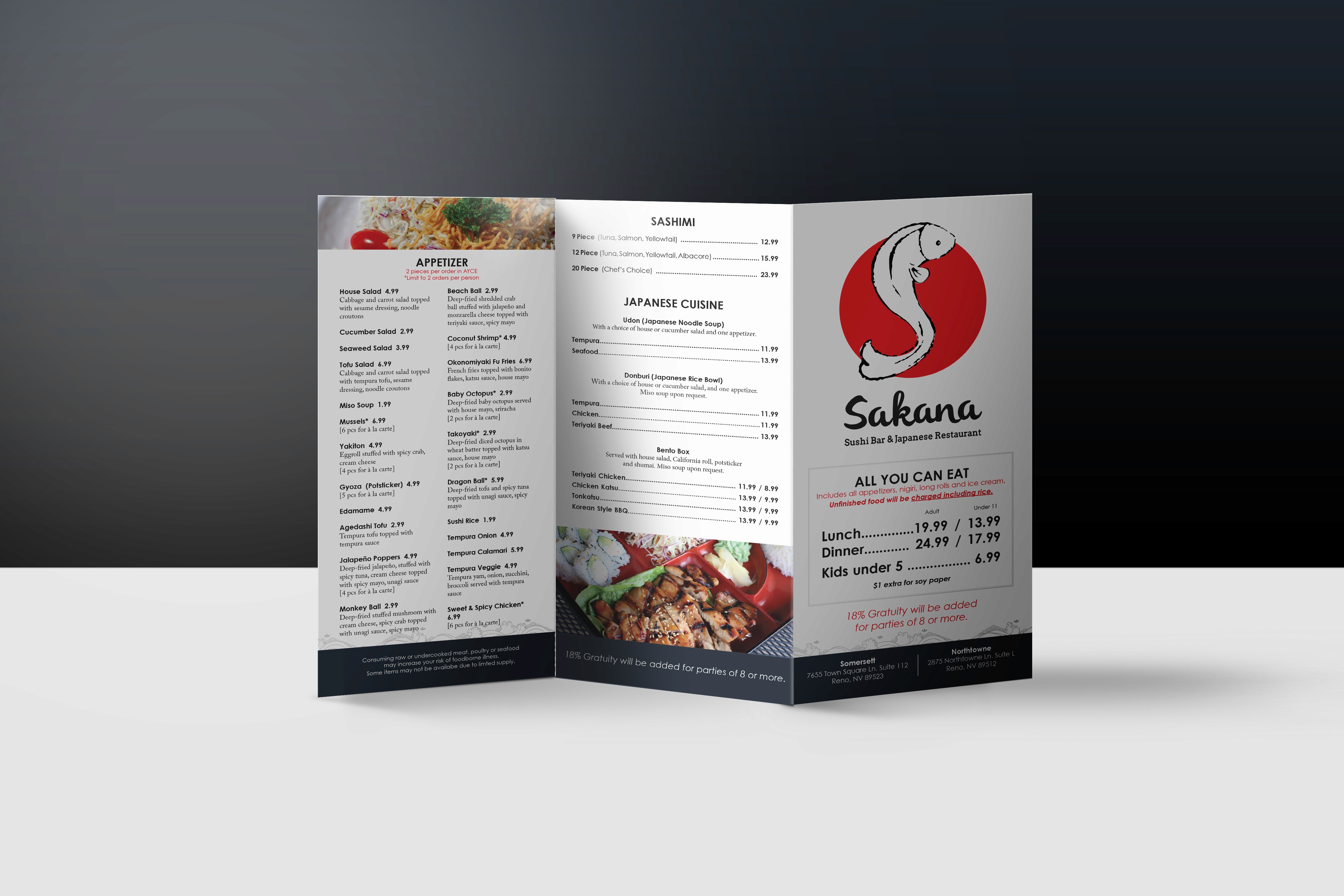 Sakana is a local restaurant located in Reno, NV that specializes in sushi and Japanese cuisine. Sakana is a literal translation of "fish" in Japanese. The logo is drawn in black brush strokes with bright red-orange color. This was a full branding project that included multiple menus, social media launching, print/digital ads, branded uniforms, hats, chopstick sleeves, business cards and food photography.