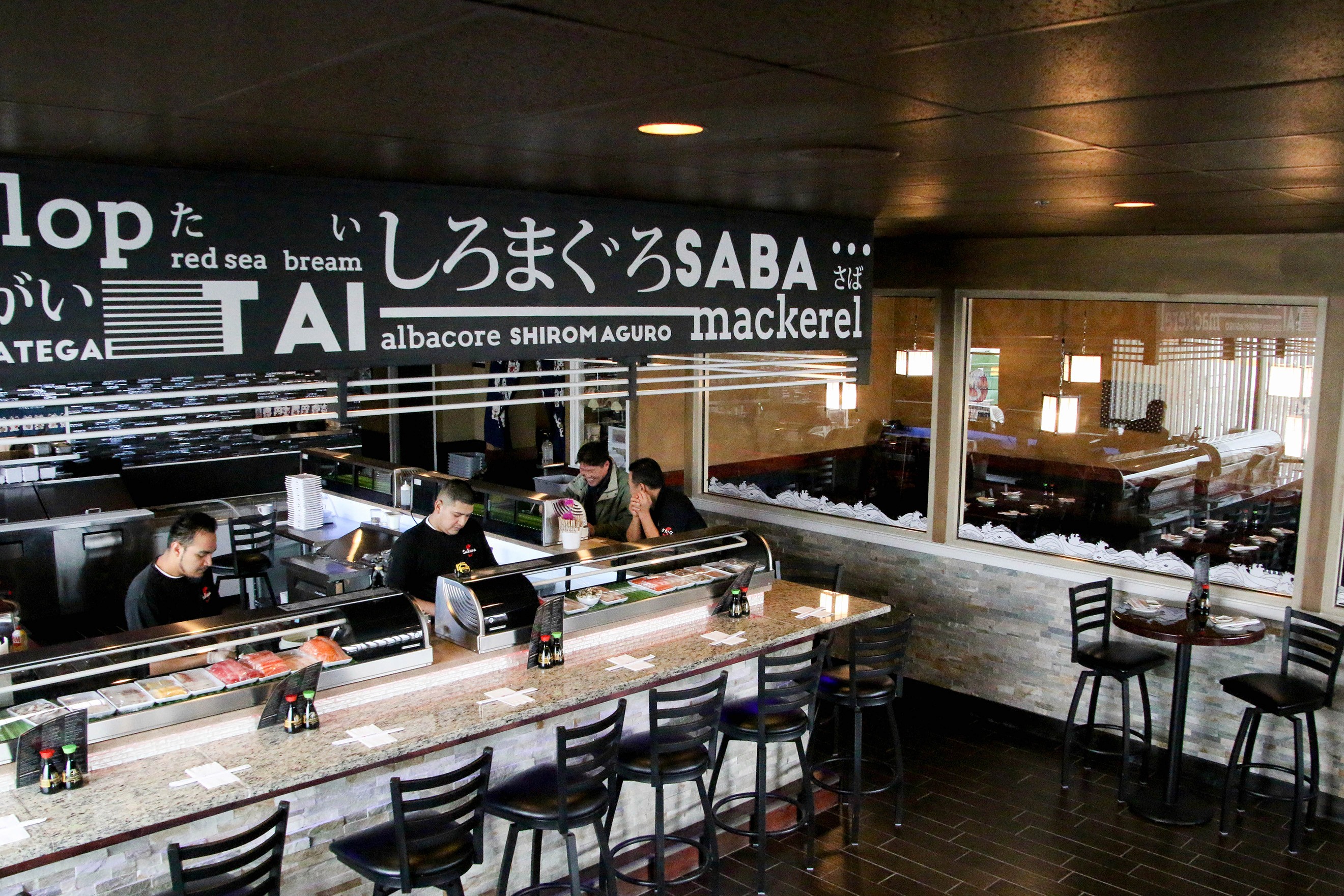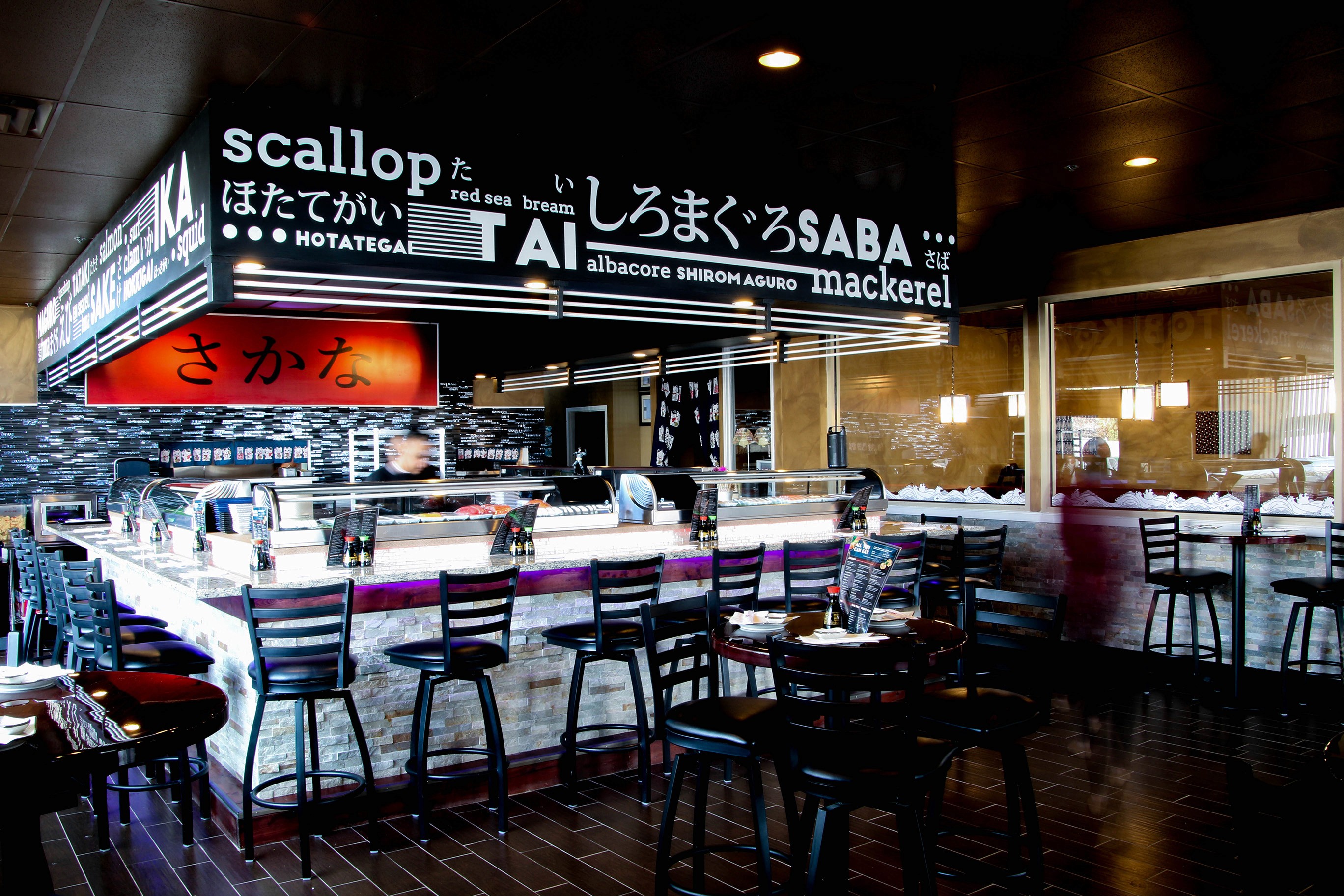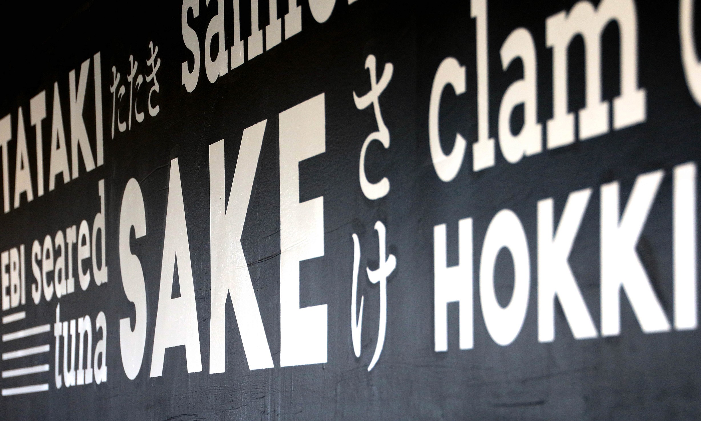 The heart of the restaurant is the open sushi bar, where chefs prepare and serve sushi to customers. I wanted this space to pop and become the centerpiece of the room. To highlight it, I created a bold design using white lettering in both English and Japanese, spelling out all the fish types Sakana proudly serves. Once the design was set in Illustrator, I printed large stencils, climbed up a ladder, and painted the lettering by hand in white.
