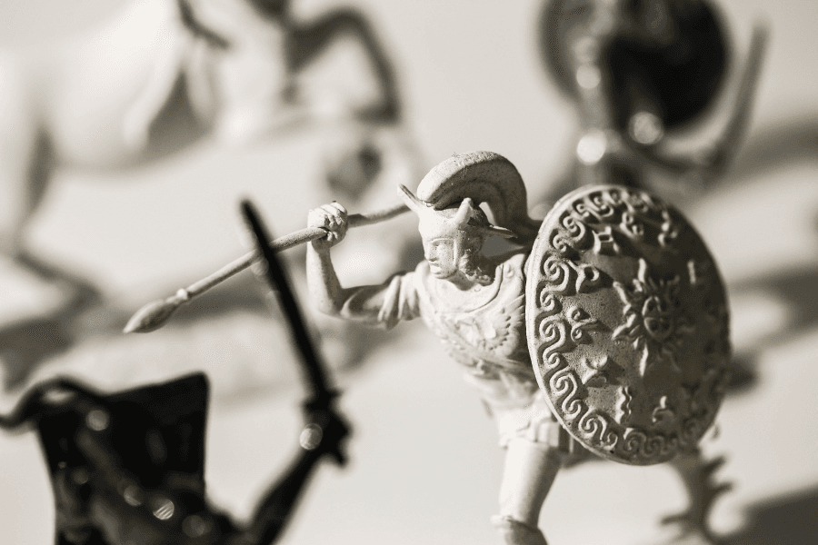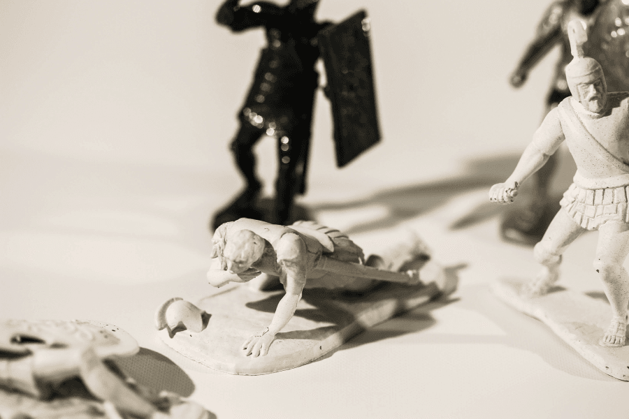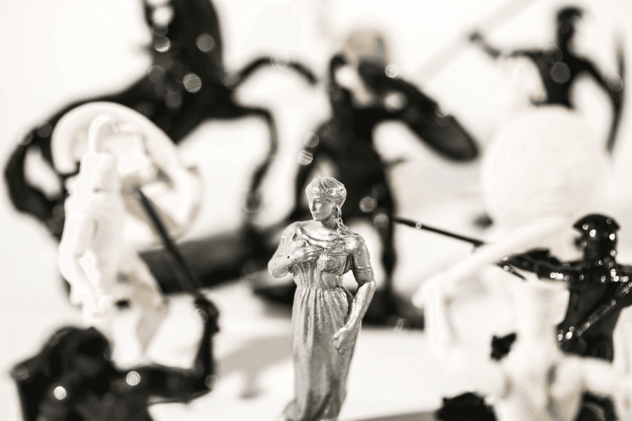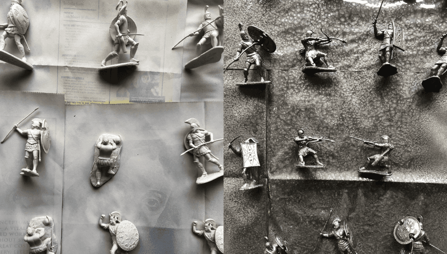 Troilus & Cressida tells a rather impure love story between Troilus, a Trojan prince, and Cressida, the daughter of a Trojan traitor, set amidst the chaos of the Trojan War. To capture that chaotic atmosphere, the plastic Trojan army toys felt perfect. Originally tan and blue, I reimagined the Trojans and Greeks in stark black and white to create a simple division. But as I considered the characters’ moral complexities, I realized that no one in this story is purely good or bad. So, I added a third layer of silver-toned figures to represent the main characters as complex, flawed individuals caught in the gray areas of conflict. And of course, our “tragic lovers” needed special treatment, so I isolated Troilus and Cressida in bright red.