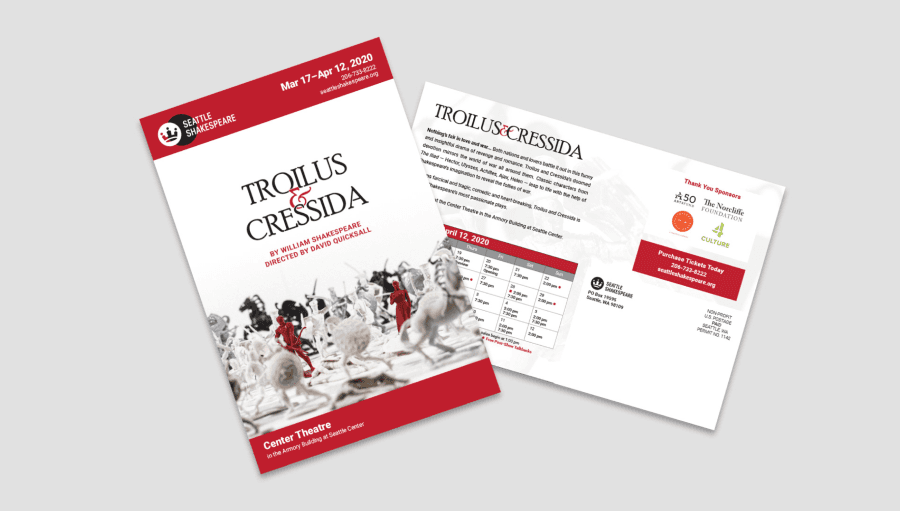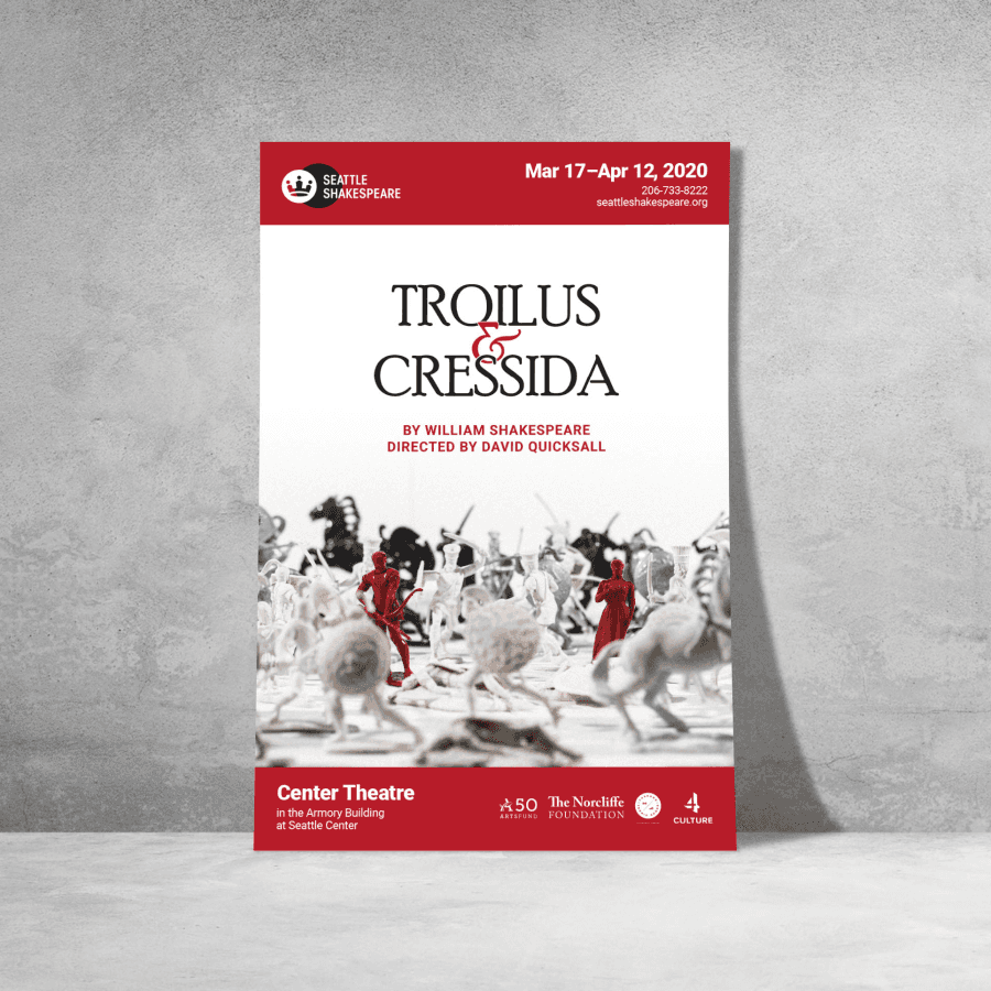Seattle Shakespeare Company took on the challenge of staging one of Shakespeare’s least popular plays, Troilus & Cressida. Known for its controversial themes and complex narrative, it’s a play that even literary enthusiasts find challenging. With few precedents for poster art, I had to dig deep for inspiration. My rabbit hole eventually led me to an Amazon product page for plastic Trojan army toys.